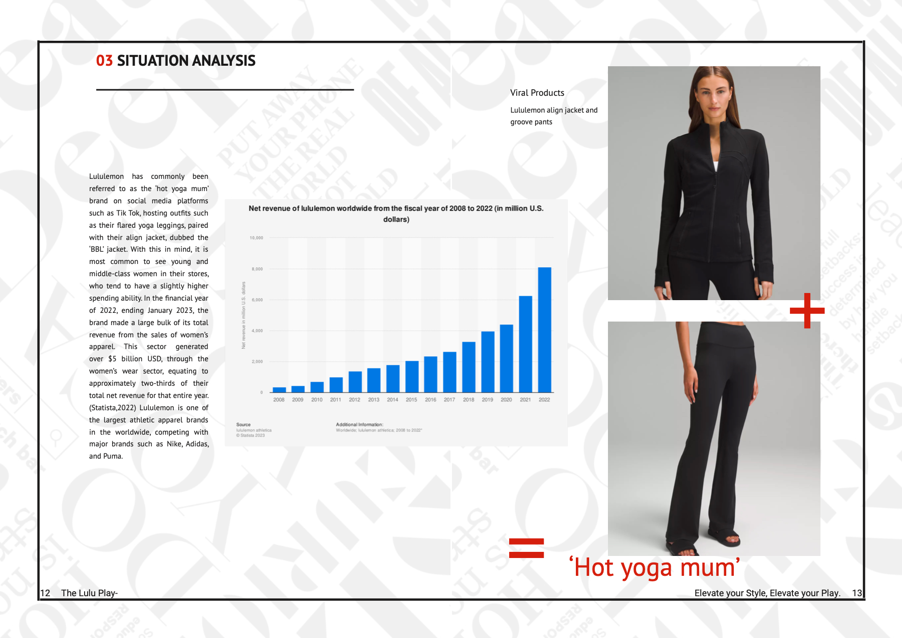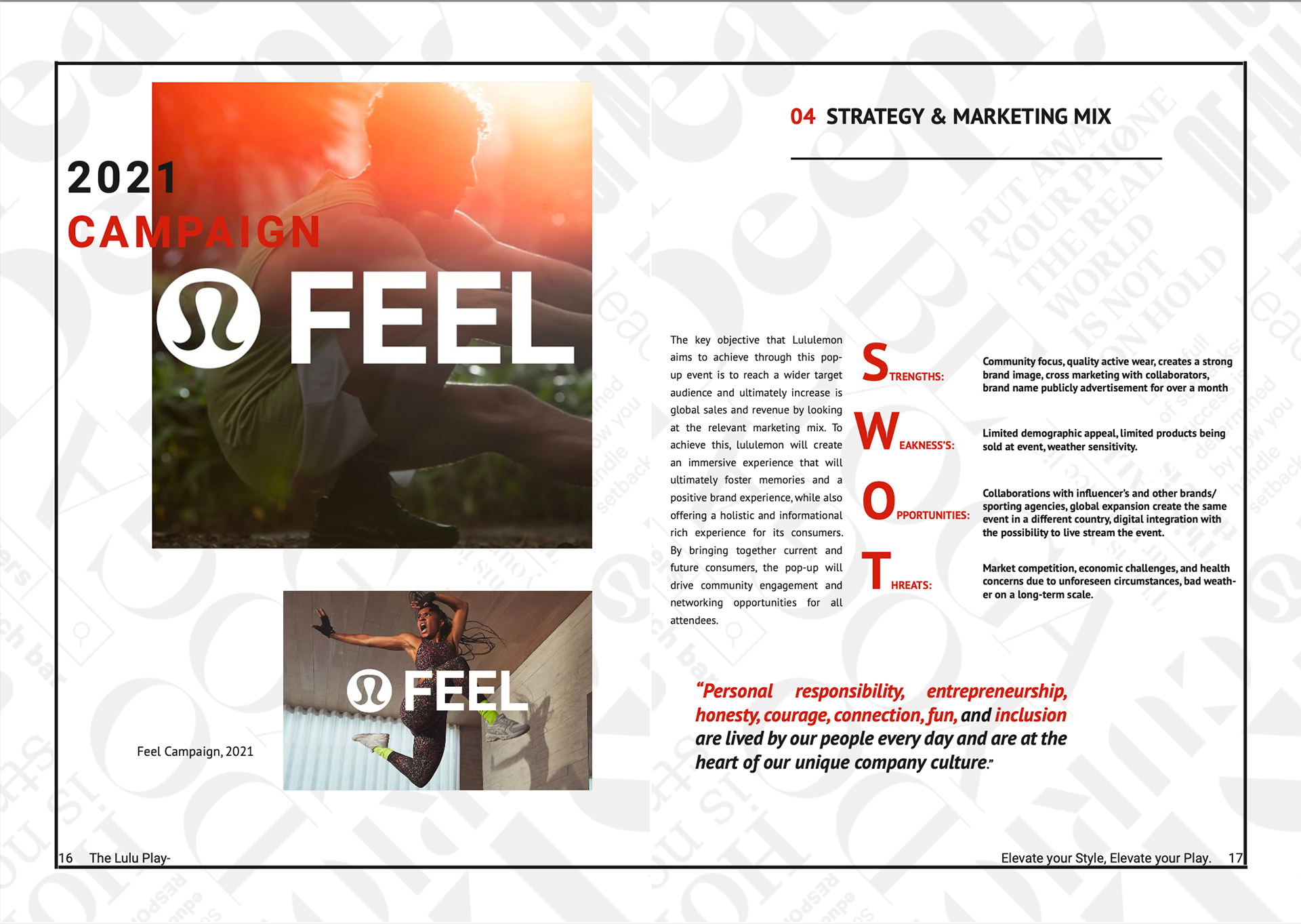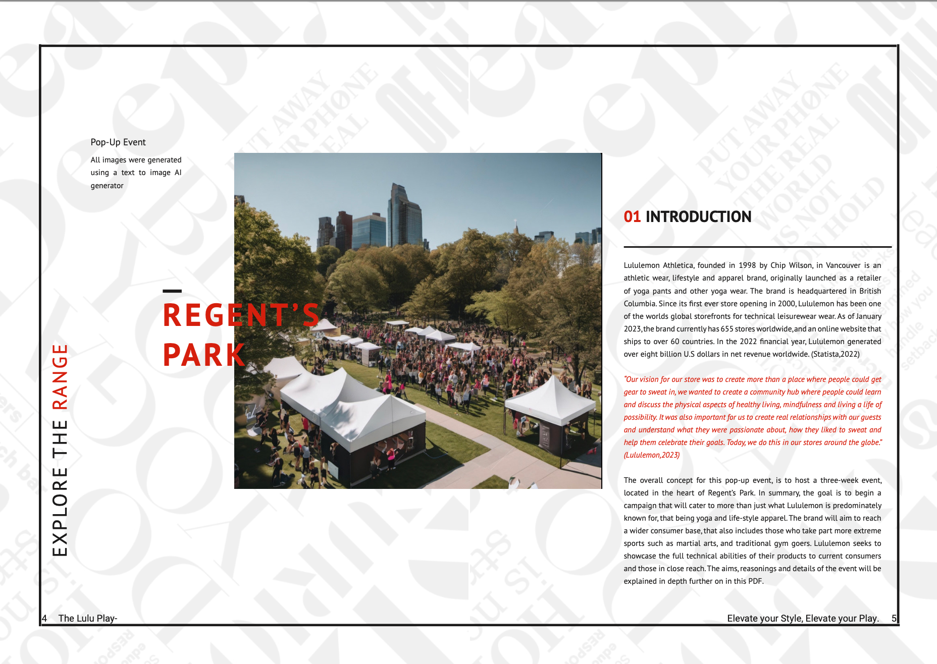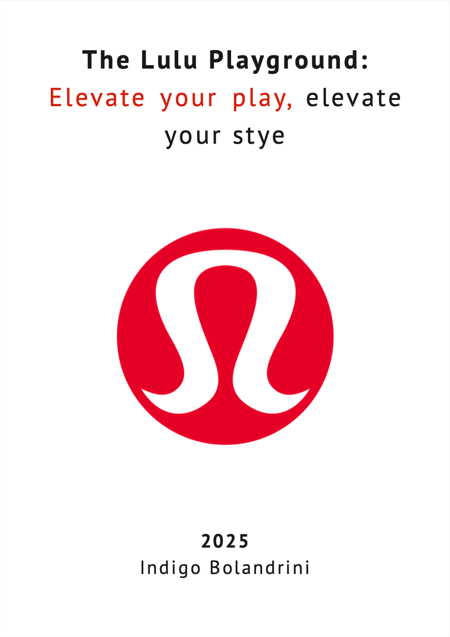 This work is a hypothetical brand extension proposal for Canadian sports wear brand, Lululemon. The main idea behind this proposal, was to introduce a pop-up event, called the Lulu Playground, in which Lululemon would showcase the full versatility of its products, using different stands, in which different sport classes would be held. This would help Lululemon reach a wider customer base, and give the 'yoga' oriented brand a new identity when it comes to sports.