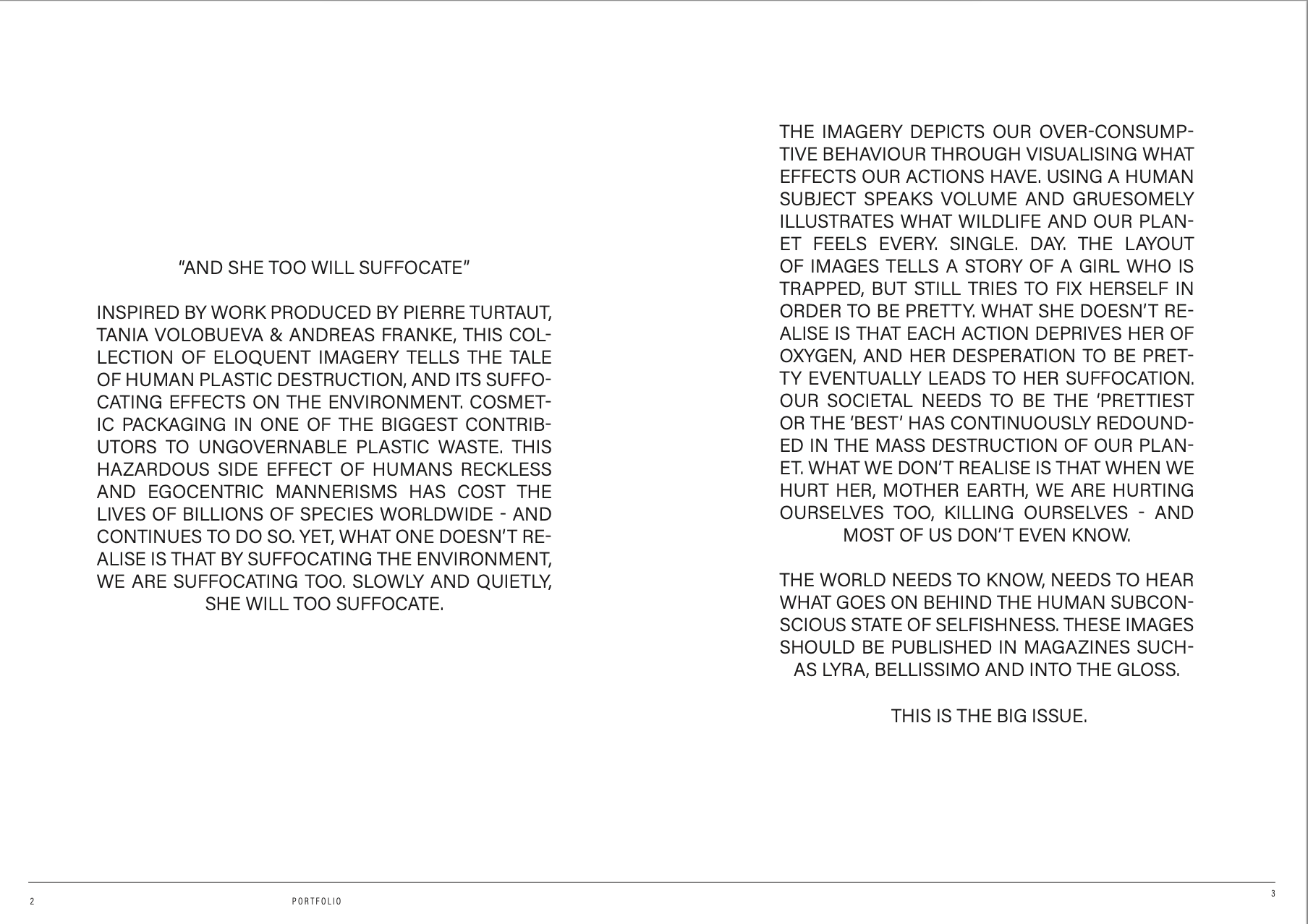 This portfolio is part of the image collection, 'And She Too Will Suffocate', which showcases the effects of beauty packaging waste, on the environment, using a human model to demonstrate the tragic effects.