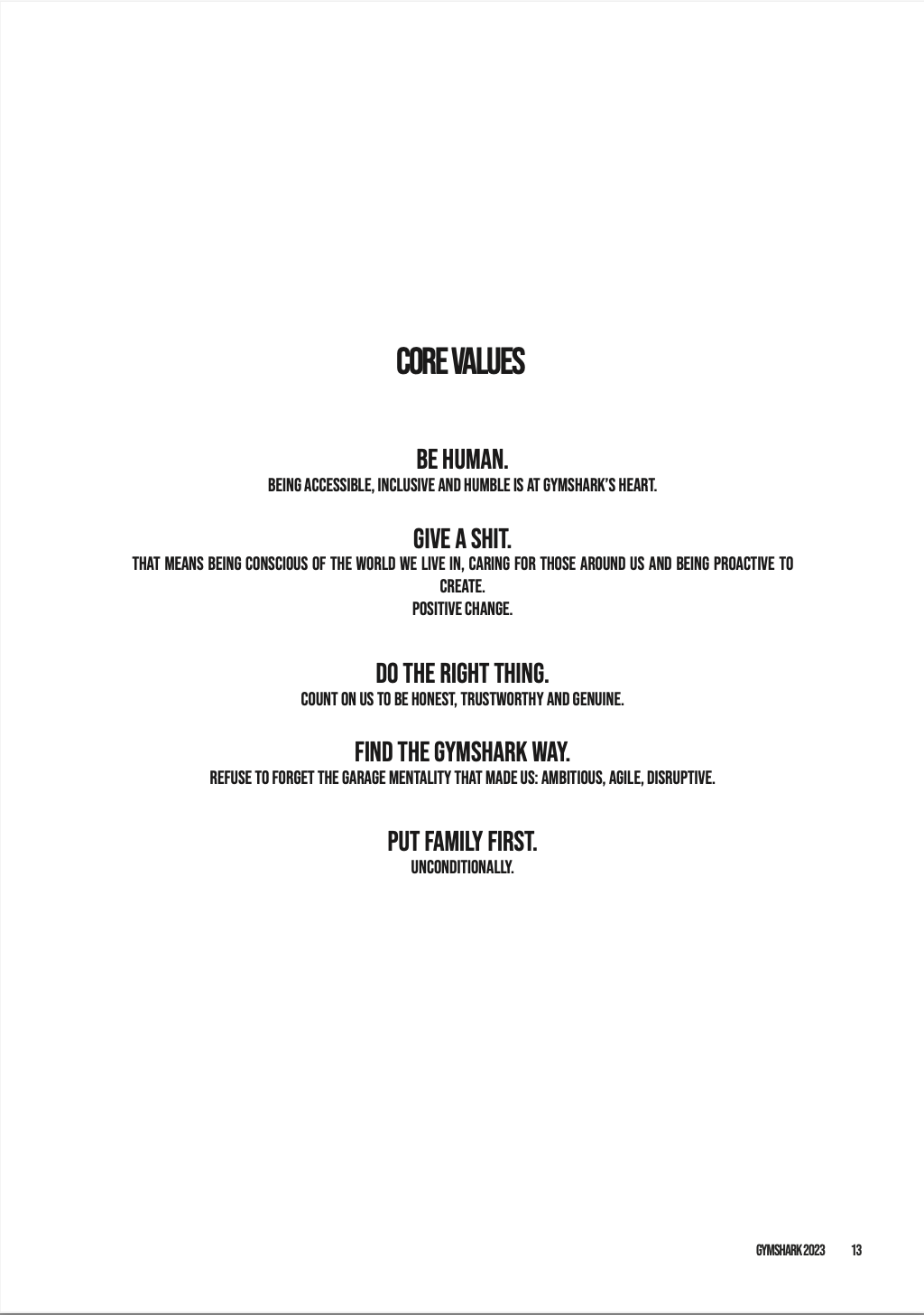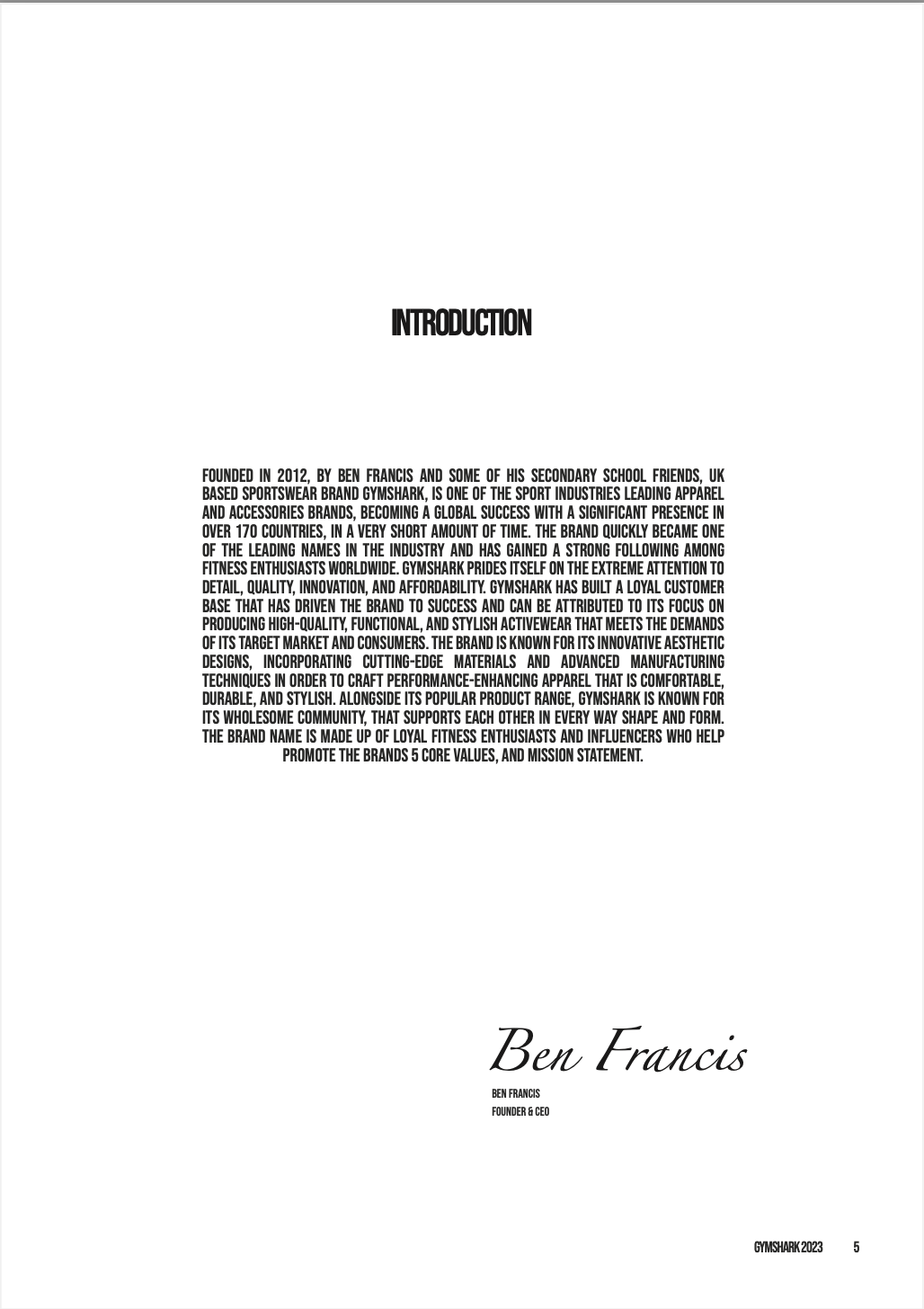 This brand book is a hypothetical brand book, for British founded sportswear brand, Gymshark. The brand book was designed to cater to the brands current identity and values, including the proposal of a new proposition to promote the brand. This proposal was the idea of opening three new gyms in prestigious locations around central London. These gyms would be exclusive to Gymshark customers and would provide a unique fitness experience that combines only the most advanced and high-quality equipment, expert training, and a supportive, safe and vibrant community.
