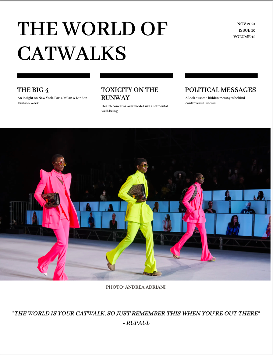 This early work is a mock-up magazine that looks into 'The World of Catwalks. It features three main topics; the four global Fashion Week events, Toxicity on The Runway, and Political Messages. It is one of Indigo's first submissions at Regent's University London.